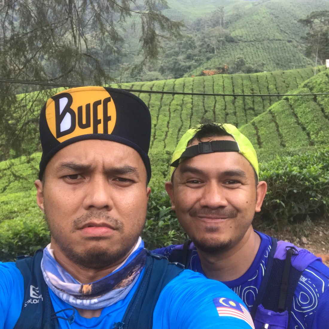 Aku mengeluarkan telefon dan selfie. Berlatarbelakangkan kebun teh.